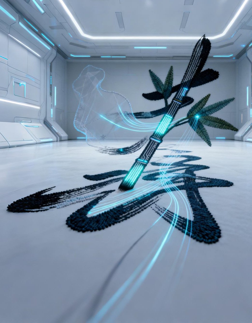 The circuit textures and neon light effects of the mechanical brush are full of technological texture. The embroidery/installation craftsmanship of calligraphic lines accurately restores the ink charm of cursive script. The material expression of bamboo branches takes into account both natural texture and future mechanical sense, which is an innovative integration of traditional craftsmanship and contemporary technology.