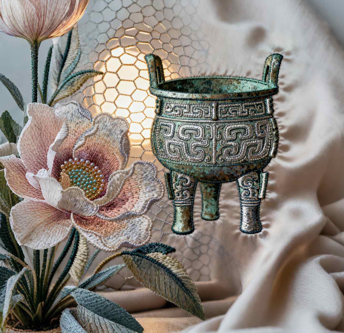 The embroidered ding with a metallic texture and the soft silk-embroidered peony form a strong material contrast. The solemnity of ancient ritual symbols and the vitality of floral elements form a visual (contrast), building a picture layer with a strong sense of story.