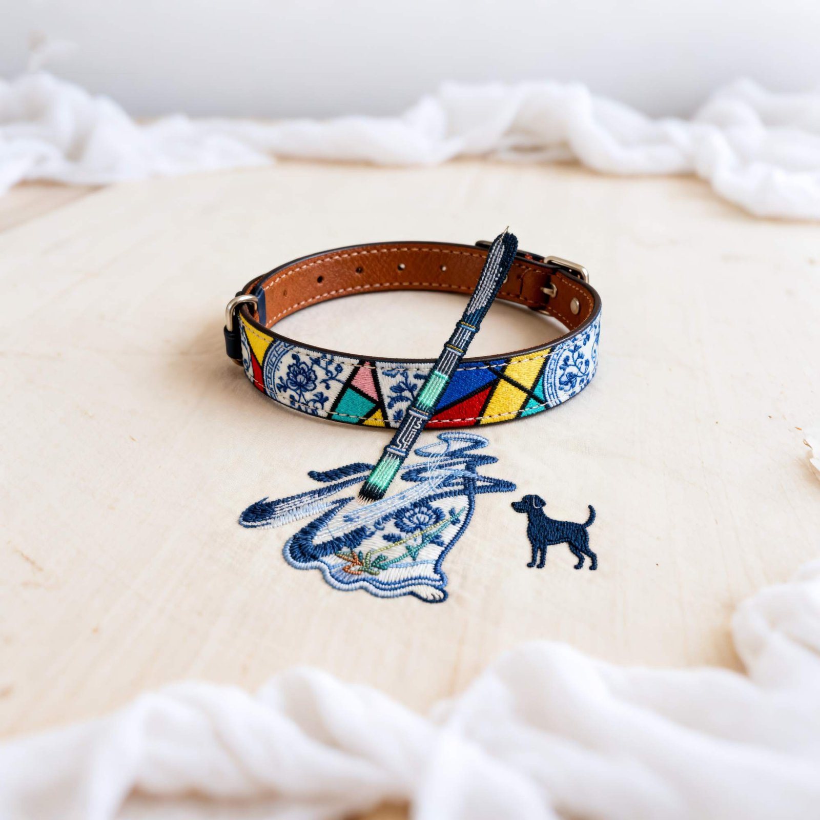 The embroidered pattern of blue and white interlaced lotus replicates the elegant charm of Chinese porcelain, with every petal hiding the implicit poetry of Oriental aesthetics; Mondrian-style geometric color blocks burst with the lively tension of modern art. The collision between the texture of leather and the delicacy of embroidery is just like your pet’s interesting shuttle between classical gardens and modern galleries. The embroidered brush and the “pet” character embroidery next to the collar quietly connect Chinese literati elegance with pet warmth, making pet accessories leap beyond the boundary of “practicality” and become a fashion carrier of cultural expression.